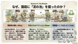 幼児期の環境にビオトープが備わることで、子ども達の自然への興味を高め、自然に対する理解を深めることができます。